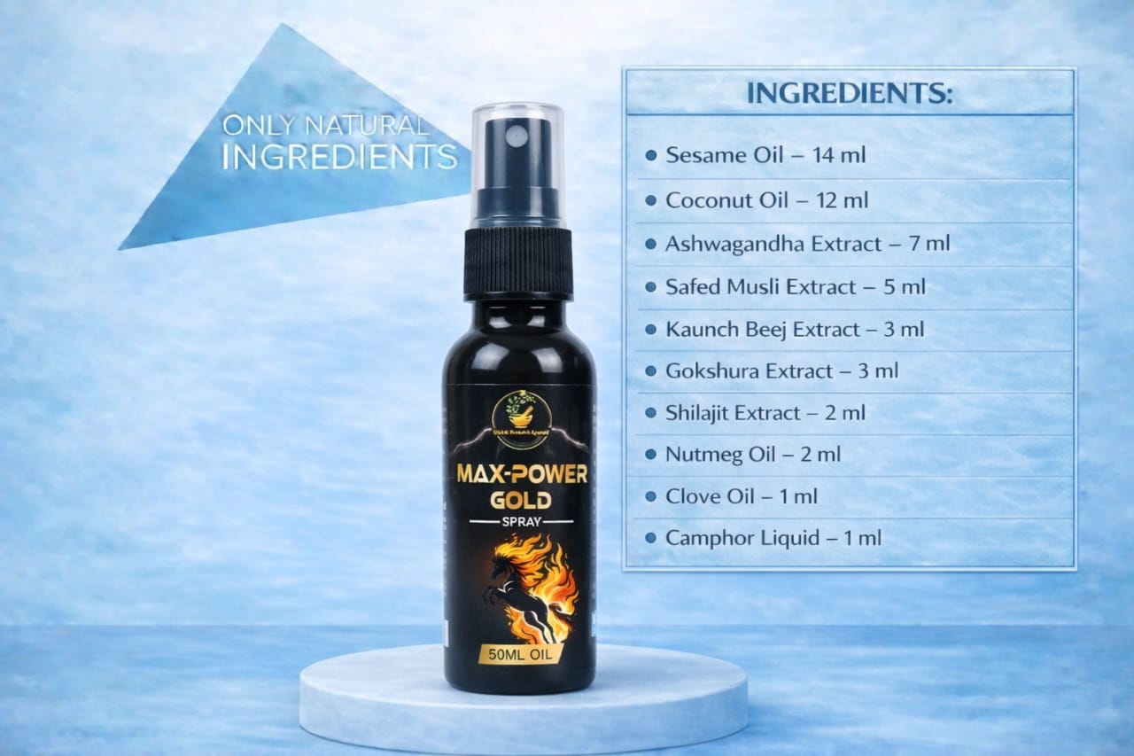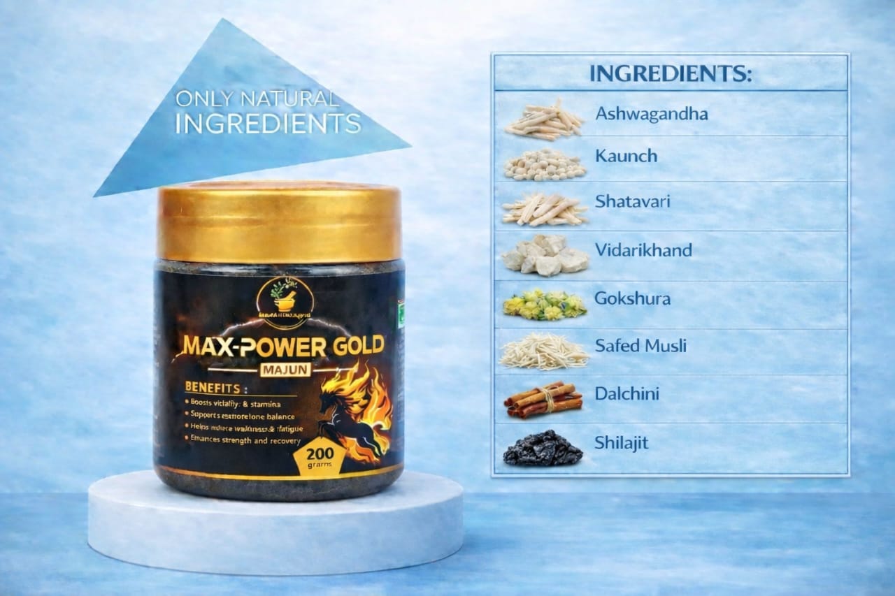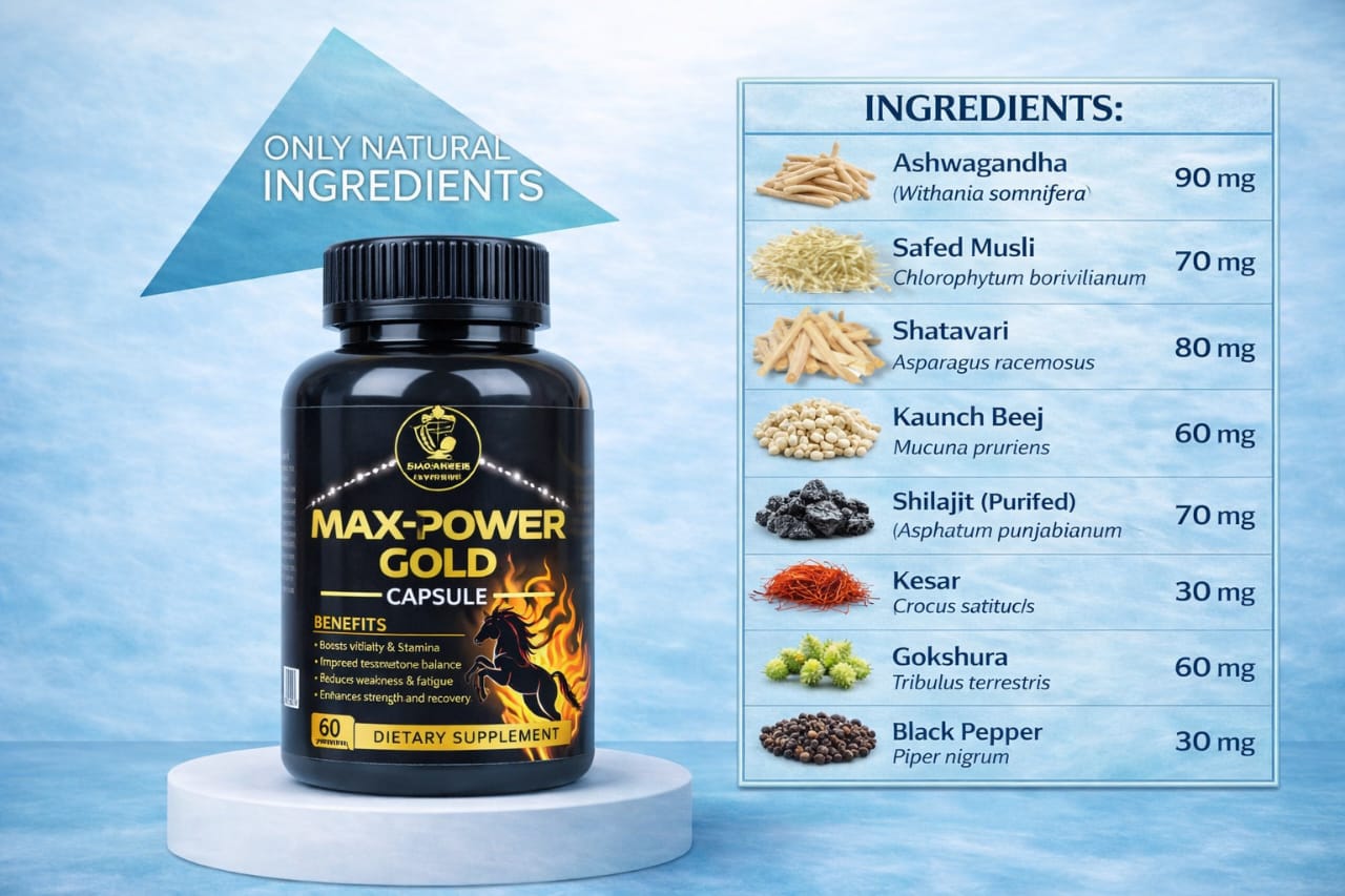 A powerful Ayurvedic formulation Max-Power Gold with Tribulus Terrestris, Piper Nigrum, Ashwagandha, Safed Musli, Shilajit and other time-tested herbs to support strength, stamina, immunity and overall wellness.